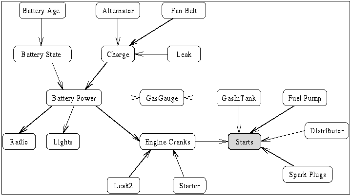 SparkPlugs Distributor FuelPump Leak2 Starter BatteryAge Alternator FanBelt Leak GasInTankThe observations are the following: