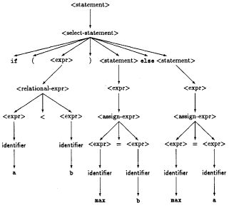 Then we can generate the example expression by selecting the following choices starting from sentence. The fact that we can generate the expression shows that it is a legal element of the language defined by the grammar. The parse tree is an aid in both the generation process and in subsequent interpretation of the expression.