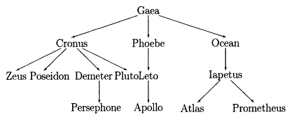 In the above family tree, Gaea is the root. Cronus, Phoebe, and Ocean are here children (or, the roots of the subtrees of the tree rooted at Gaea...)