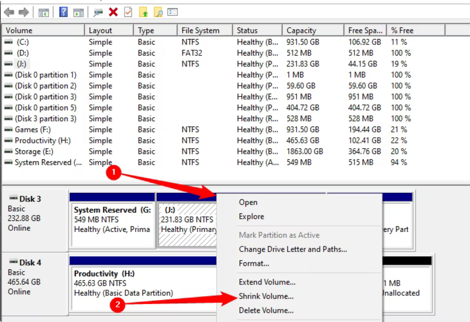 To resize a partition, right-click on it, and select Shrink Volume… from the context menu.