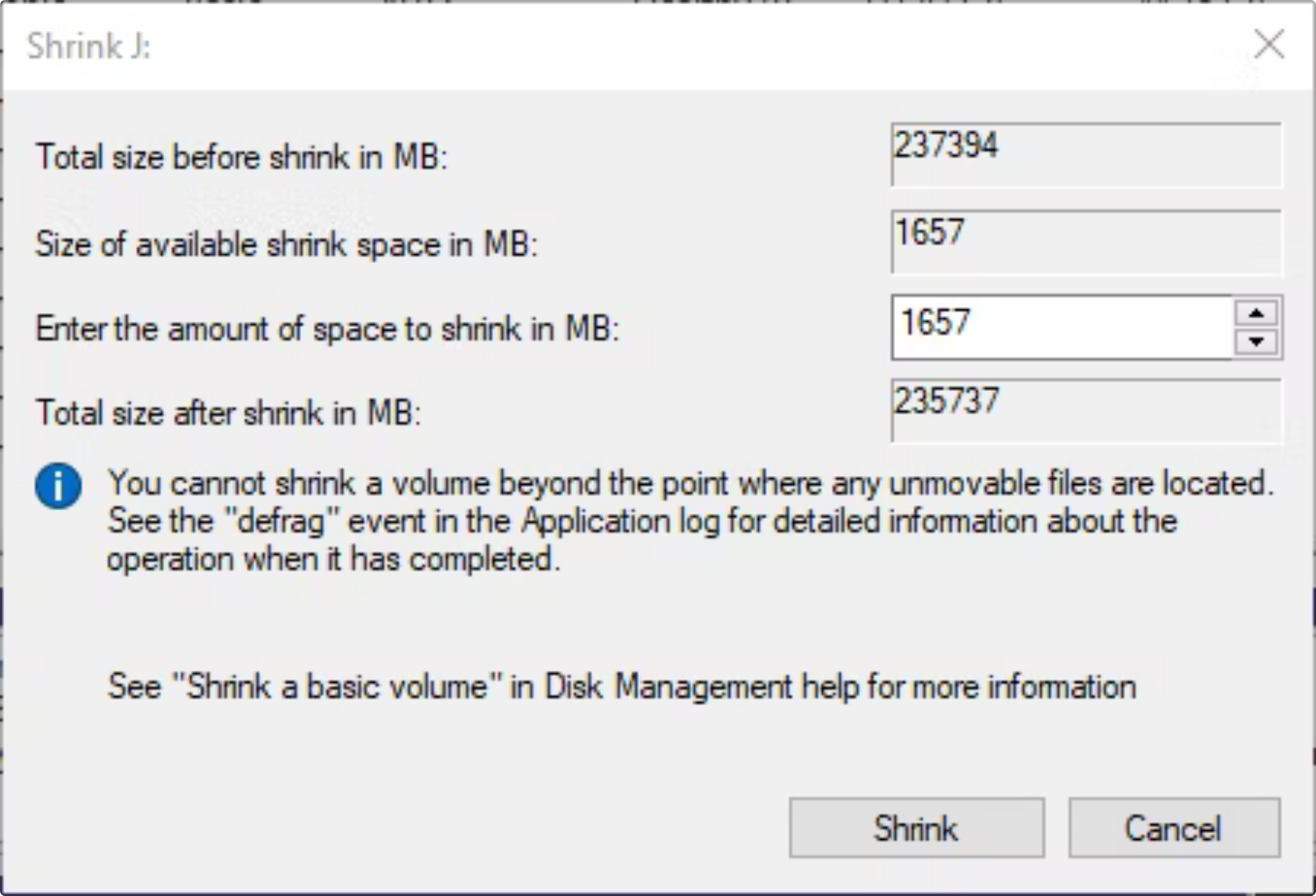 In the modal window, enter the amount of space to shrink, and select the Shrink button. A minimum of 15,000 MB is recommended for our purposes. You will be able to adjust partition sizes later if necessary.